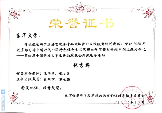 近日,我院收到由教育部高校思政课教学指导委员会主办、南开大学yl8858永利集团承办的“领航计划”系列活动之“绽放抗疫青春·决胜全面小康”——第四届全国高校大学生讲思政课公开课展示活动证书。学生团队张荆京、苏长恒在比赛中荣获优秀奖,指导教师为我院院长王治东教授及青年教师张乂凡博士,这也是我校首次在“大学生讲思政课”活动中斩获佳绩。