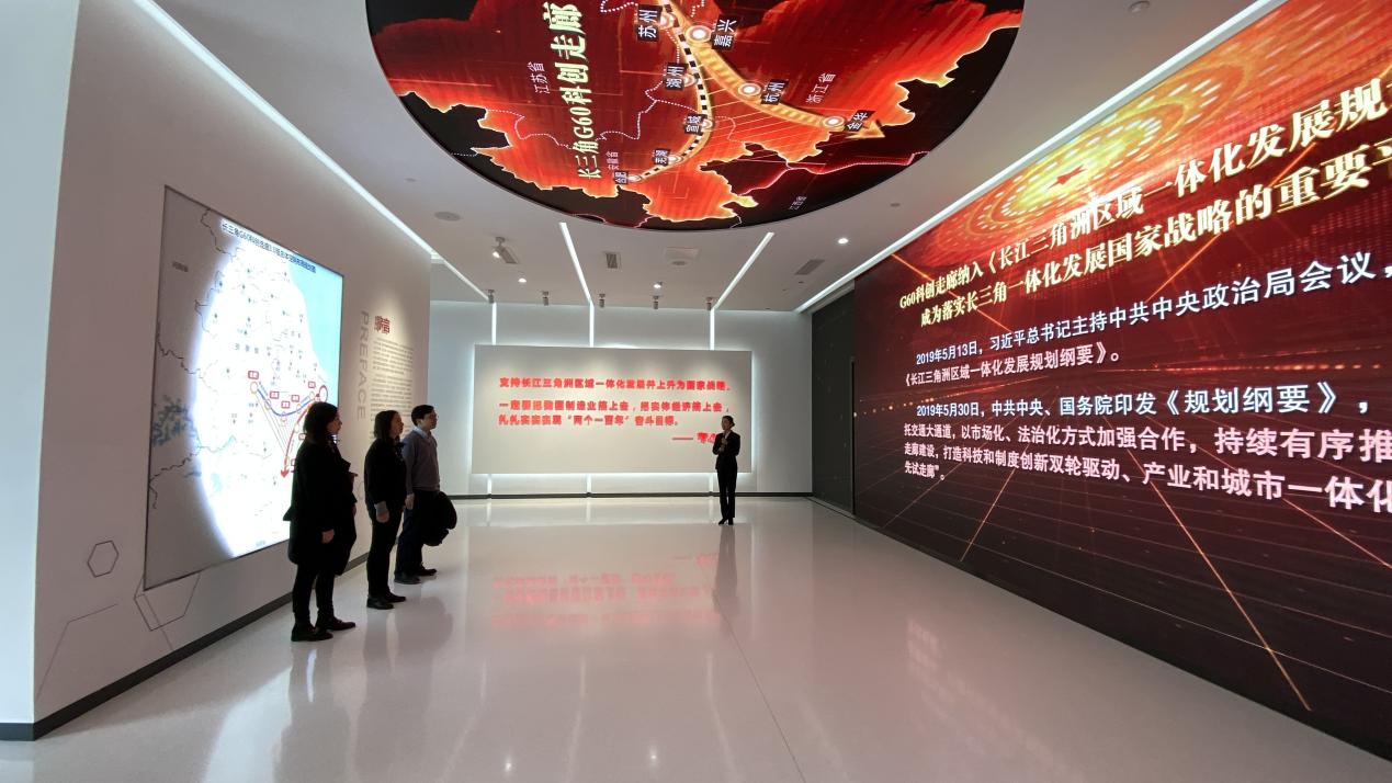 会后,一行人赴G60科创走廊展示馆进行了参观学习,在讲解员的带领下,详细了解了G60科创走廊从上海松江区的1.0版本,到沪嘉杭联动的2.0版本,再到沪苏浙皖九地区的3.0版本不断扩容升级的过程,并对其产业集群布局进行了初步了解。
