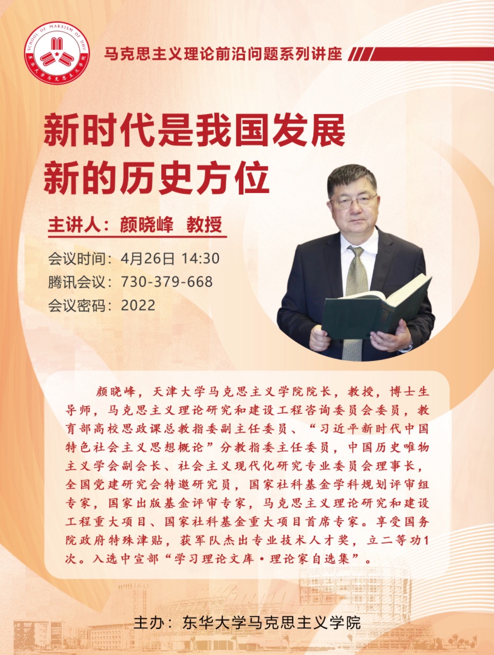 4月26日下午,新一期马克思主义理论前沿问题系列讲座在线上召开,天津大学yl8858永利集团院长颜晓峰教授应邀为我院师生作了主题为“新时代是我国发展新的历史方位”的学术讲座。讲座由王治东院长主持,学院教师代表、研究生以及博士生及线上来自全国各地师生参加。