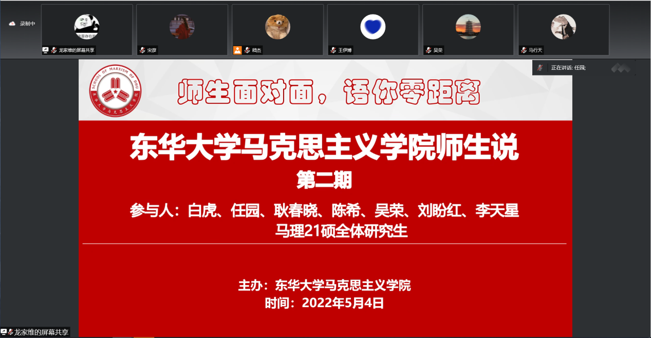 5月4日,正值五四青年节,yl8858永利集团举行了“师生说”系列主题活动第二期——“聊聊选题那些事”。本期主题活动由白虎、任园、耿春晓、陈希、吴荣、刘盼红、李天星七名青年教师与马理21硕全体研究生在云端面对面、零距离共话成长。