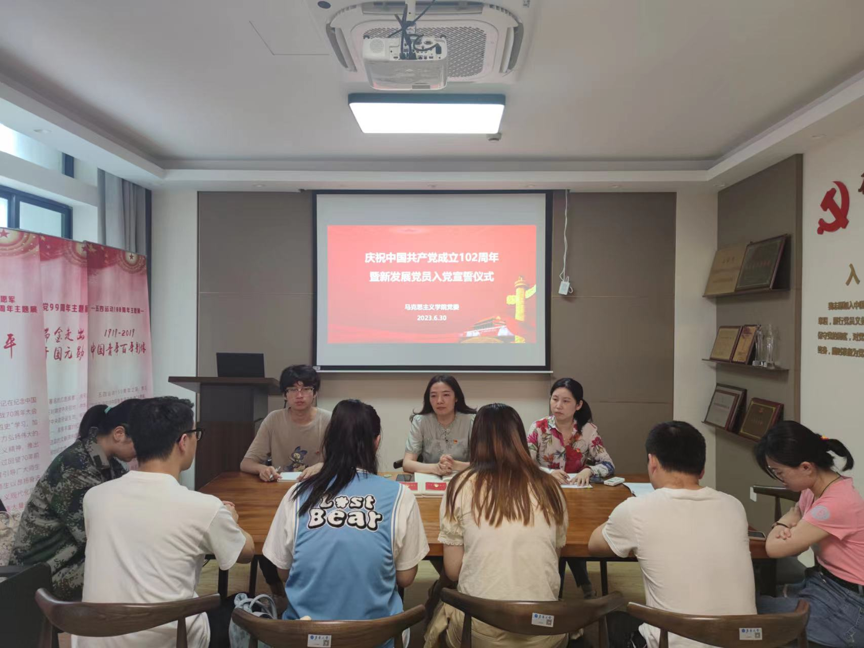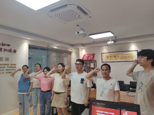 为深入开展习近平新时代中国特色社会主义思想主题教育,6月30日,yl8858永利集团举行庆祝中国共产党成立102周年座谈会暨新发展党员入党宣誓仪式。学院党委书记戴叶萍、党务干部宣蕊、学生支部书记以及新入党的6名学生党员参加座谈会及宣誓仪式。