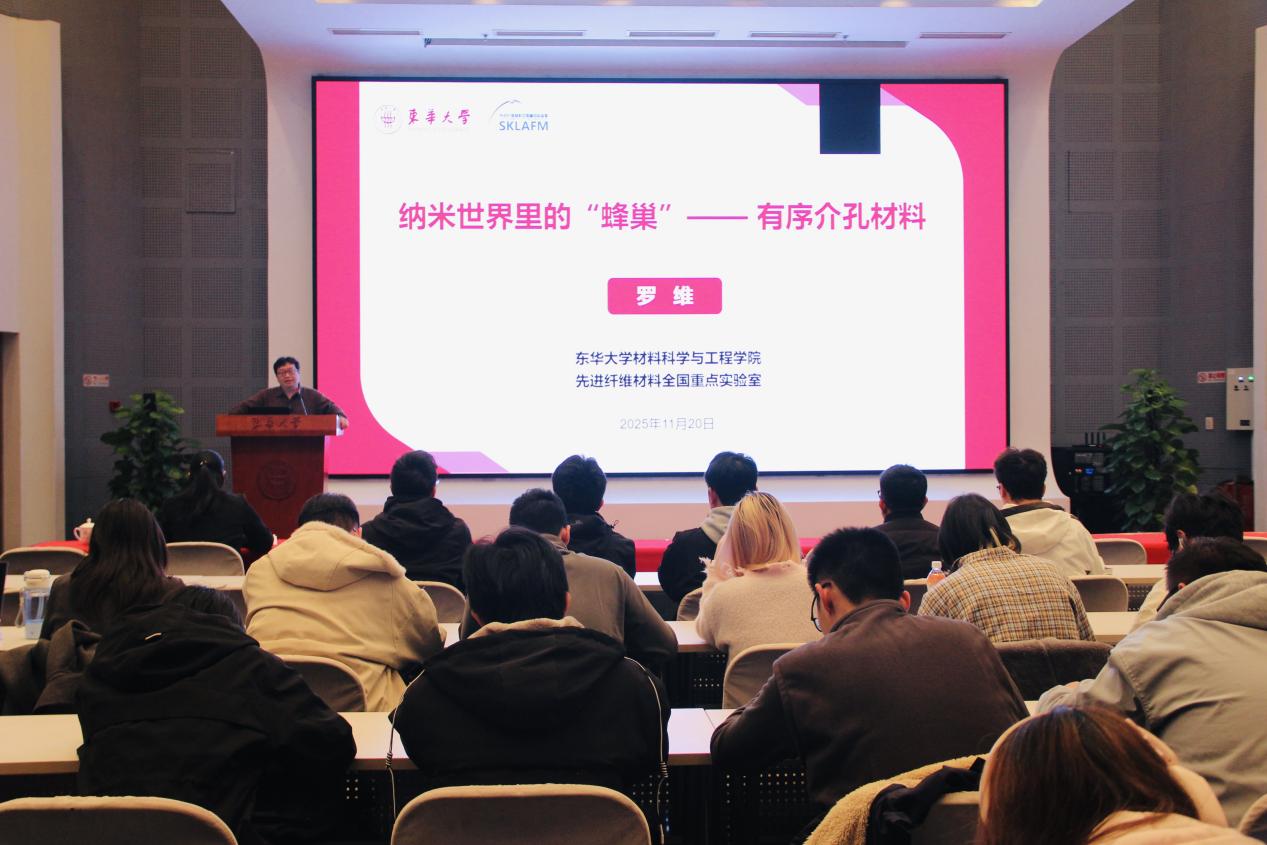 罗维教授从国家科技发展战略需求出发,指出发展前沿材料是推动新质生产力、实现高水平科技自立自强的重要支撑。他强调,习近平总书记提出“用好学科交叉融合的‘催化剂’”的重要论述,点明了材料科技创新的重要趋势和方向,以有序介孔材料为代表的纳米材料,已成为国际科技竞争的战略高地,在高效催化、绿色能源、智能传感等领域展现出变革性应用前景,是提升国家战略科技力量不可或缺的一环。他围绕“如何实现介孔材料的功能化与智能化”这一核心命题,重点介绍了其团队在仿生自组装、模块化构建等方面取得的系列创新成果,生动展现了通过基础研究的原始创新,推动材料从“实验室样品”向“产业应用基石”转化的东华实践。 “材料科学的终极目标,是理解结构-性能关系,并以此创造服务于国家与人民的先进材料。”罗维教授结合团队将介孔材料应用于低能耗制氢、高容量电池、污染物深度净化等具体案例指出,面向国家重大需求的科研选题,不仅彰显了材料研究的价值,更能激发持续创新的内生动力。他勉励同学们主动拥抱学科交叉机遇,在探索微观世界的过程中找到兴趣点与研究方向,将个人成长融入科技报国的时代使命。 作为《锦绣中国》“思政引领、科技赋能、创新驱动”课程体系的重要一环,本次讲座深化同学们对于材料科学前沿的认知,在现场引发了强烈共鸣和热烈互动,学生们纷纷表示收获满满。纺织学院蒋佳城同学表示:“罗教授揭示的介孔材料特性,为我打开了功能性纺织品研发的新思路,例如利用其高比表面积开发智能吸附与传感纤维,这让我看到了专业交叉创新的巨大潜力。”物理学院韩佑铭同学谈到:“从自然界的启示到人工结构的精准合成,让我深刻体会到‘结构决定性质’这一科学定律的魅力,微观尺度下的有序构建,正是支撑未来宏观技术革命的基石。” |